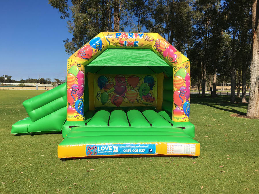 Love Bouncy Castles offers the ultimate generic PARTY TIME DISCO jumping castle WITH SLIDE for your child’s party in Perth. Watch the children’s faces light up with joy as we blow up the bouncy castle in your back yard/park/community centre. All our castles have a roof cover to protect you from the sun and/or rain.