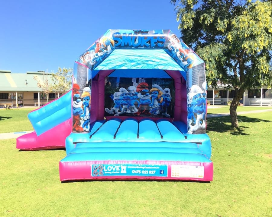 Sit back, relax and watch as your child’s face lights up as they dance and bounce around with their friends whilst listening to their favourite music INSIDE the castle. This Smurfs Combo castle FEATURES A SLIDE coming off of the main jumping area. All our castles have a roof cover to protect you from the sun and/or rain.
