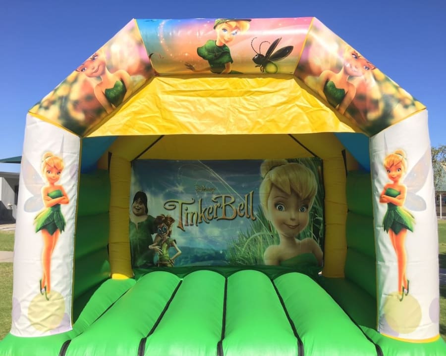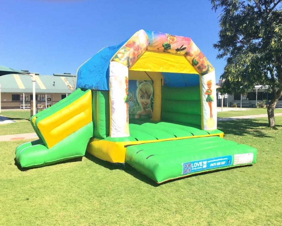 Love Bouncy Castle will bring the BIGGEST SMILE to your child’s face when they are jumping, dancing & singing to their hearts content with their friends on our DISCO JUMPING COMBO CASTLE! Come and join Tinkerbell, your favourite fairy on the jumping castle AND SLIDE! All our castles have a roof cover to protect you from the sun and/or rain.