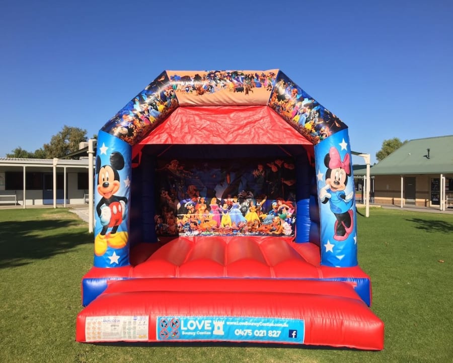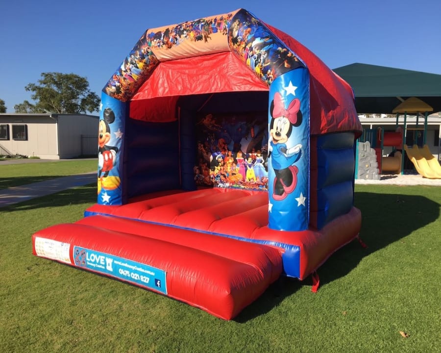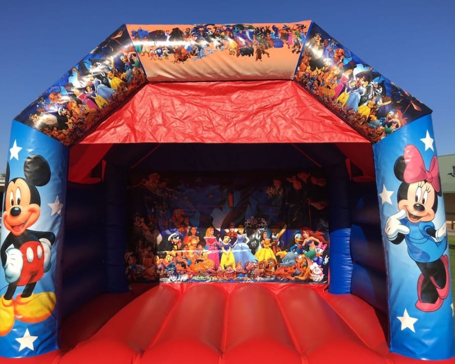 Watch as your child’s face lights up when we blow up their favourite characters, MICKEY & MINNIE MOUSE on this castle! The little ones LOVE this castle, and there are BIG SMILES ALL ROUND when Disney music is played INSIDE the castle for the kids to sing, dance and bounce around to. All our castles have a roof cover to protect you from the sun and/or rain.